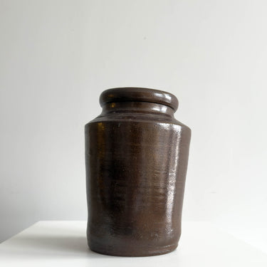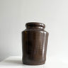 A classic utilitarian form with enduring appeal, this vintage stoneware has a deep, glossy brown glaze revealing subtle tonal variation and surface texture. Once used for food preservation or dry storage, it now offers endless styling versatility.