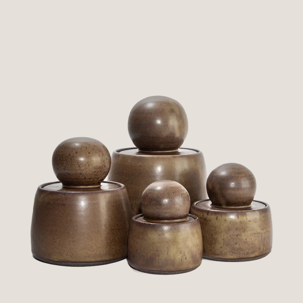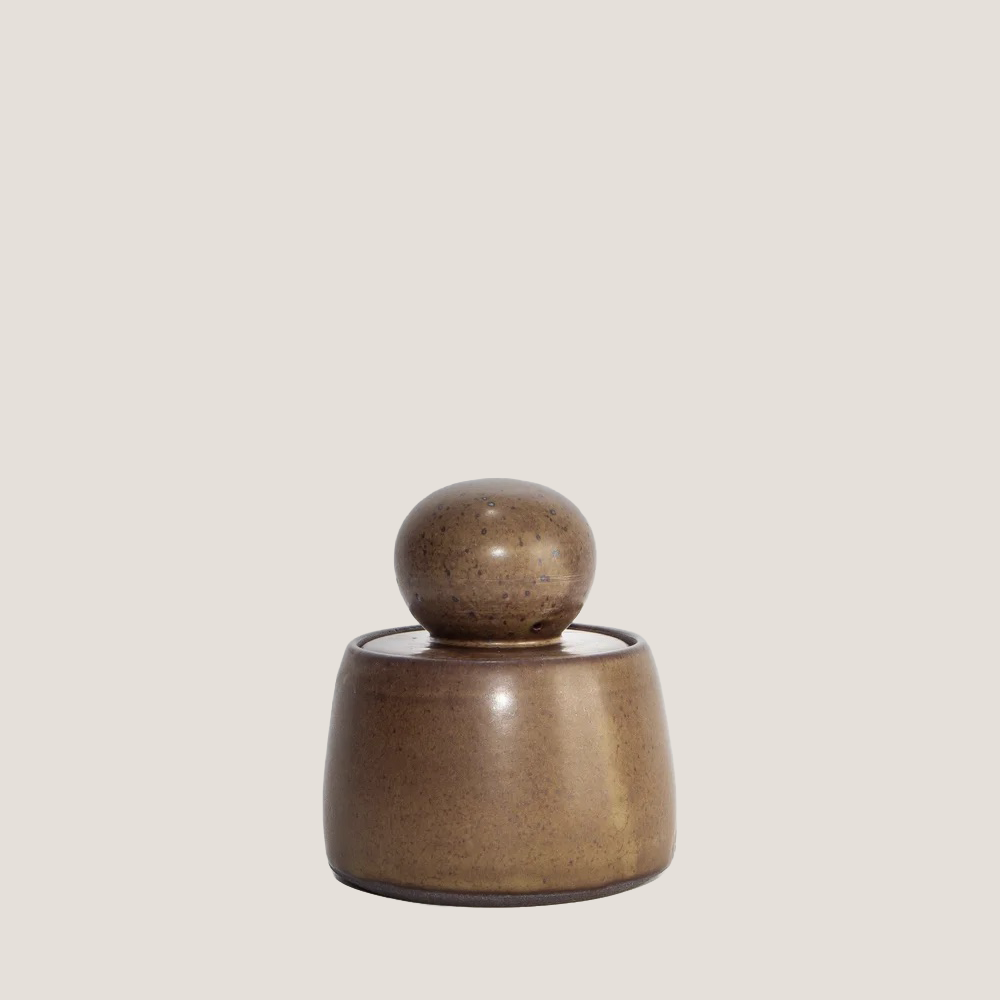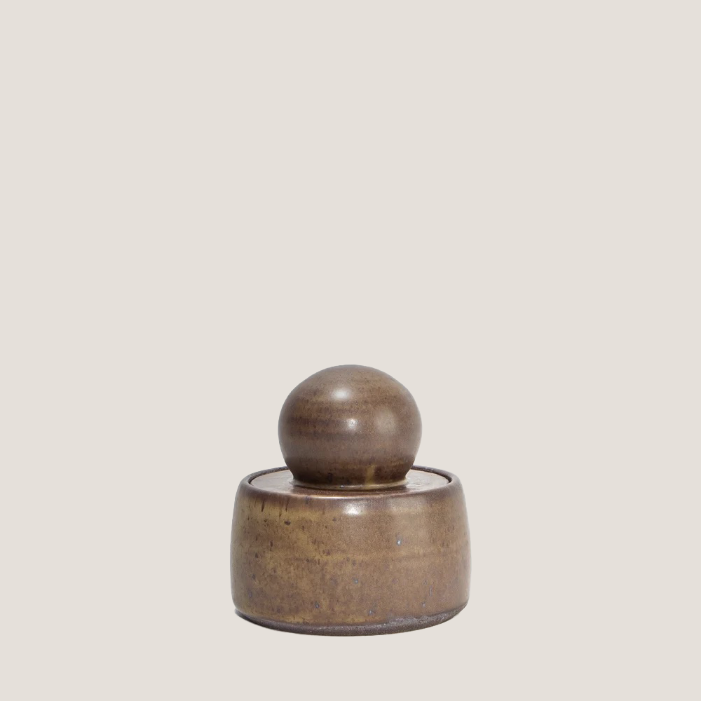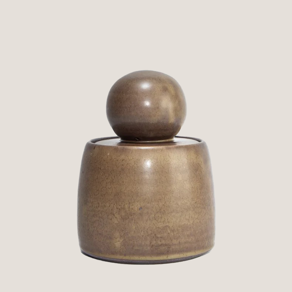 Hand-thrown in Pasadena, the Olive Brown Stash Jar is wheel thrown and glazed in a nuanced olive tone with subtle crackling that gives it quiet character. The perfectly weighted spherical lid fits neatly inside the rim, creating a smooth, sculptural profile. Use it to tuck away herbs, keepsakes, incense cones, or other small treasures. A satisfying blend of form and function, it looks just as good on a shelf as it does in use.
