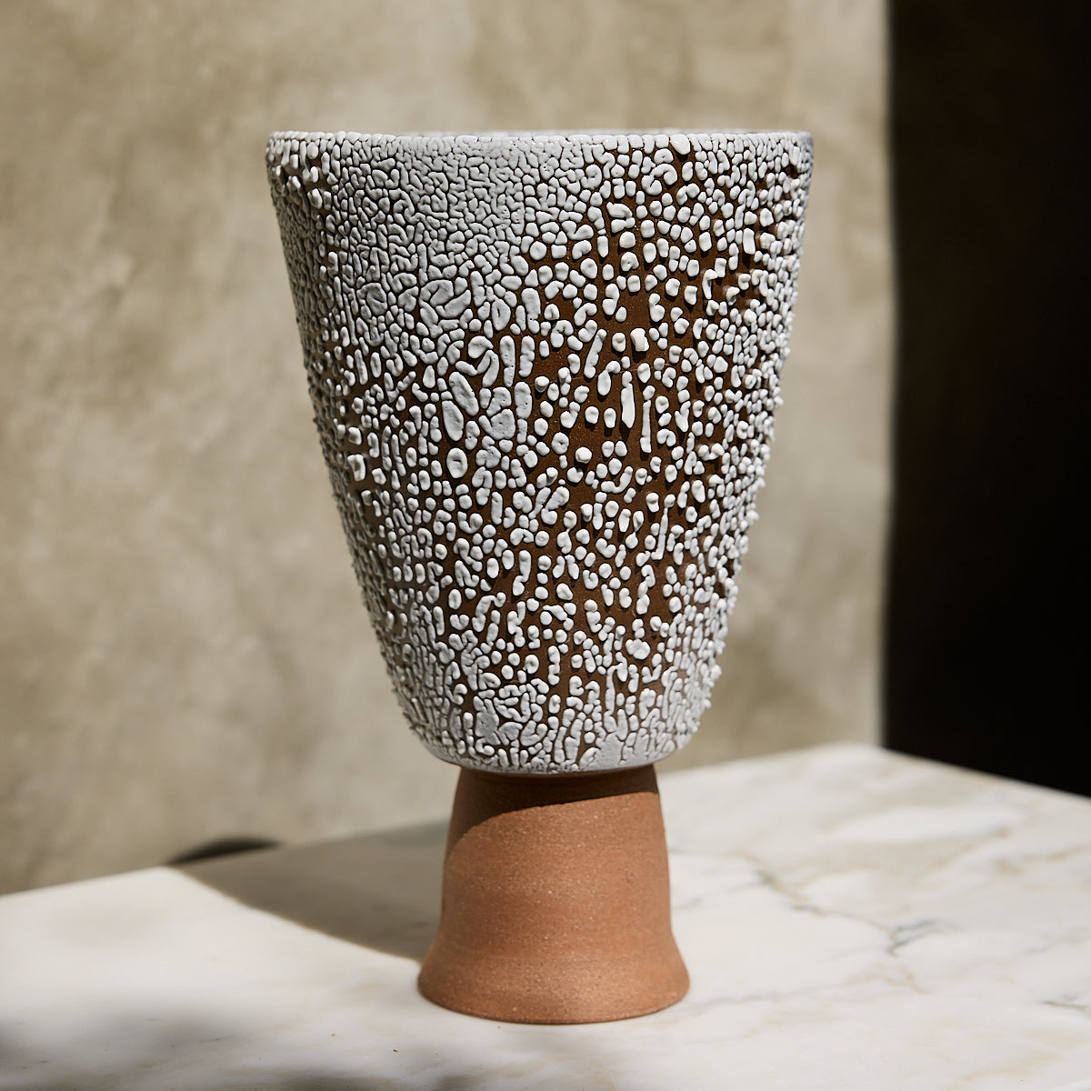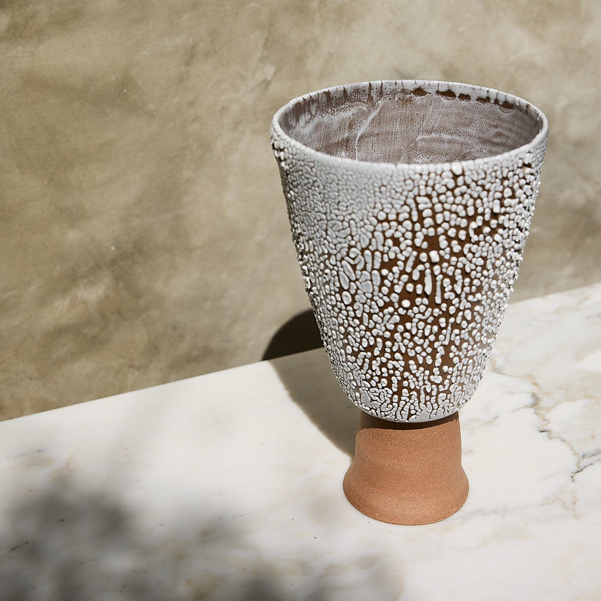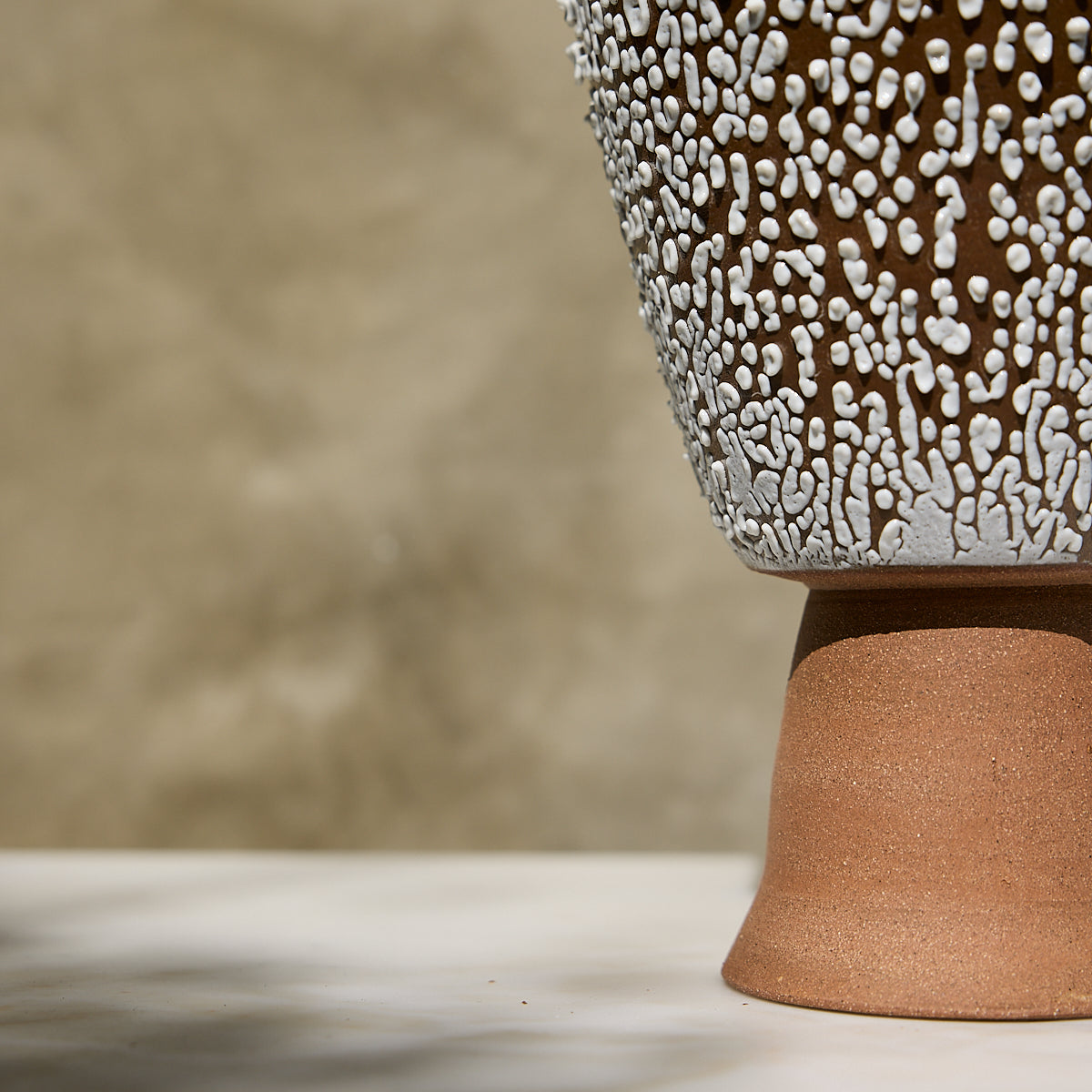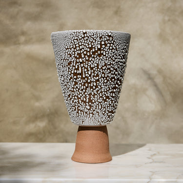 The Divine Pedestals are a harmonious blend of artistry and utility, crafted to elevate any display. Perfect for floral arrangements, stacked fruit, or anything your heart desires, these delicate beauties boast a one-of-a-kind exterior. The unpredictable glaze dances in the fire, creating unique textures and shapes that ensure no two pieces are ever the same.