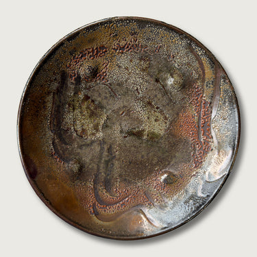 A striking vintage find, this hand-thrown ceramic bowl reveals a richly layered glaze in tones of copper, rust, moss, and smoke. The expressive surface texture is full of depth, where delicate crackling meets molten-like movement, giving the piece a painterly, almost volcanic quality. At 15” in diameter, it’s large enough to serve as a bold centrepiece. A one-of-a-kind piece for collectors who value character, patina, and presence.