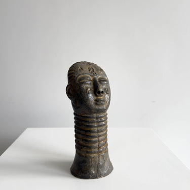 Curio Bust No. 2 features a hand-sculpted face with deep-set eyes and a ridged elongated neck, echoing traditional portrait forms found across West African regions. Its dark glaze is softly worn, revealing the textured ceramic beneath and inviting close study. Whether styled alone or alongside collected objects, this piece adds a striking, soulful note to any space.