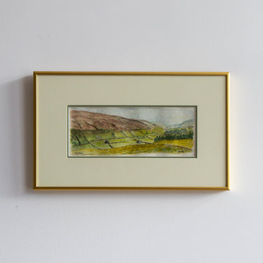 A quietly poetic study of the English countryside, this vintage watercolor by Nicholls captures the undulating hills and pastoral stillness of Settle, Yorkshire. Rendered with gentle brushwork and a warm, earthy palette, the composition invites a slow gaze — hedgerows, cottages, and farmland dissolving into the soft light of a distant horizon. Professionally double-matted in cream and sage and framed in brushed gold, this piece offers a timeless window into rural Britain.