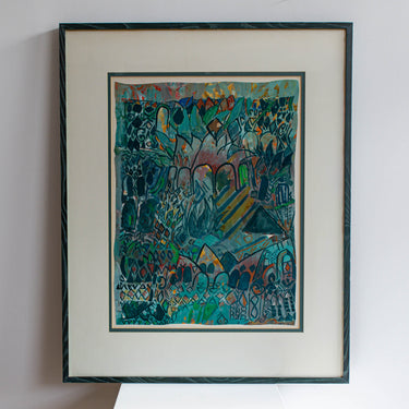 A richly layered gouache composition that pulses with colour, texture, and gesture. This expressive abstract work combines geometric motifs and organic forms in a palette of deep teals, rusts, and emerald green, with rhythmic black linework guiding the eye through the visual tapestry. Though the artist remains unknown, the piece is signed and professionally framed by Aati Gallery in Dubai, a gallery known for elevating modern works with museum-quality craftsmanship. The solid wood frame’s subtle green stain brings out the jewel tones within the composition, while the generous scale commands attention in any room.