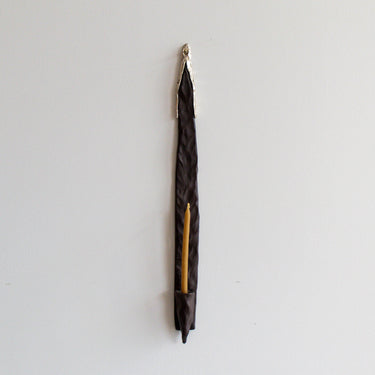 A sculptural candle sconce shaped by hand, with soft, irregular contours that reveal the artist’s touch. The piece is finished with a sterling silver tip — a subtle detail that catches and reflects the smallest trace of flame.