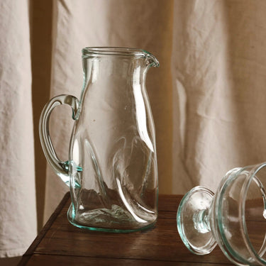 A hand-blown pitcher shaped through a twisting motion while the glass is still molten, creating a subtle, rhythmic texture across the surface. The form feels fluid and slightly irregular, reflecting the movement of the process.