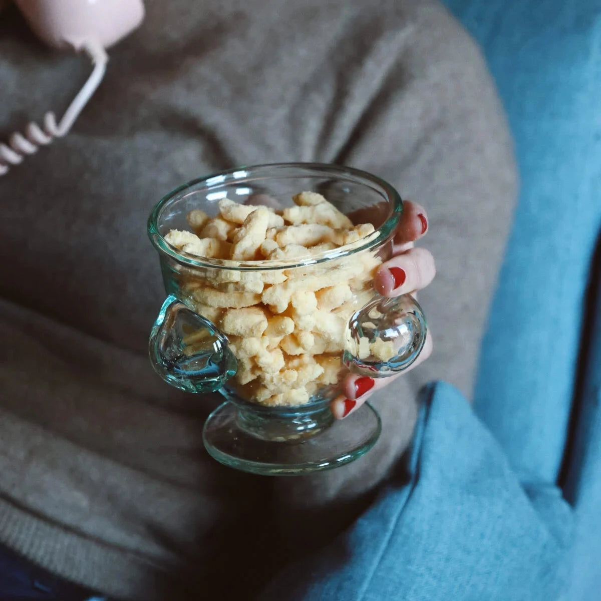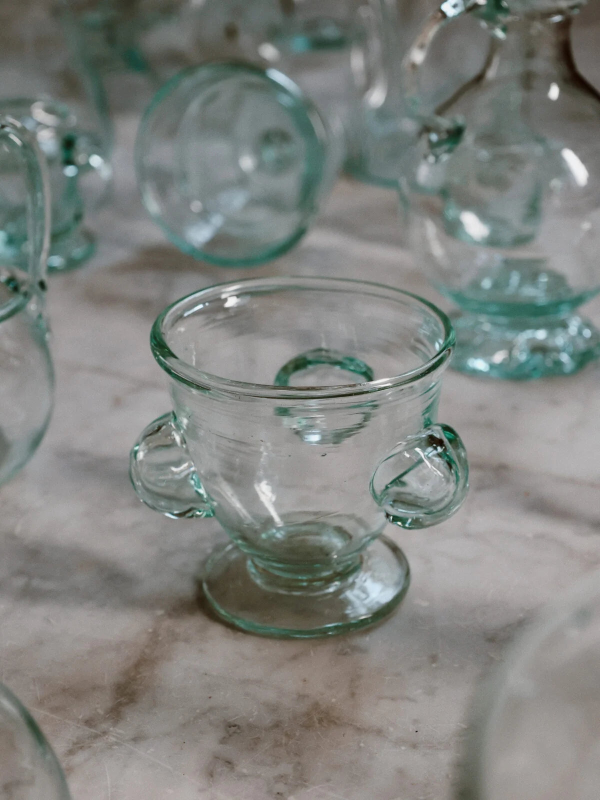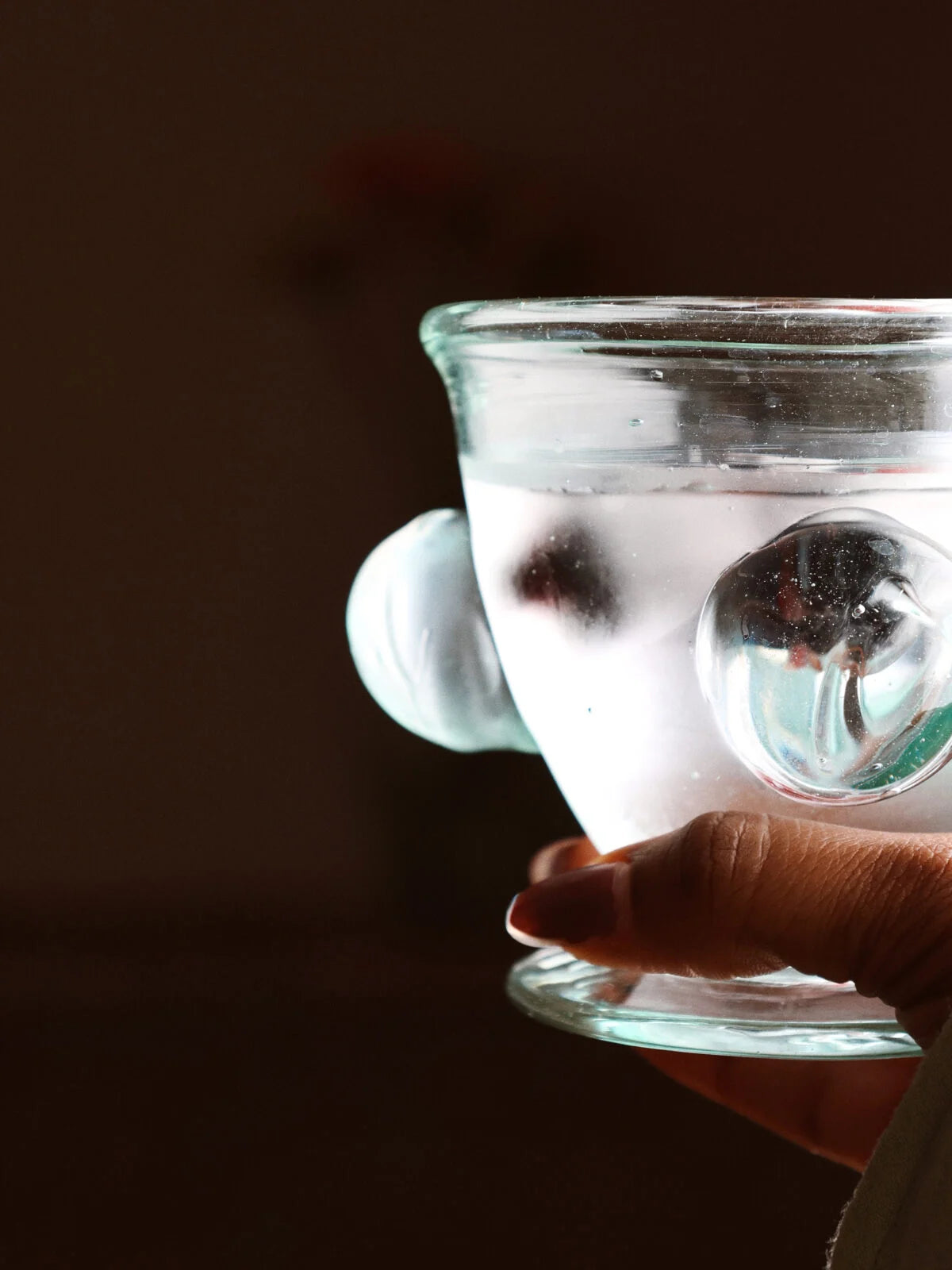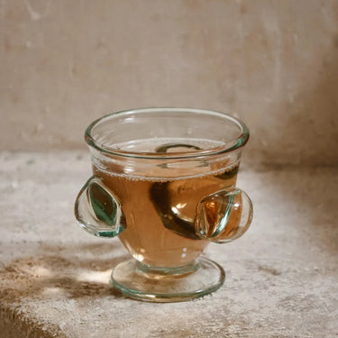 A hand-blown glass with a rounded bowl, short foot, and applied side forms that read almost like handles. The shape is compact and slightly exaggerated, giving it a sculptural presence while still functioning as a drinking glass.