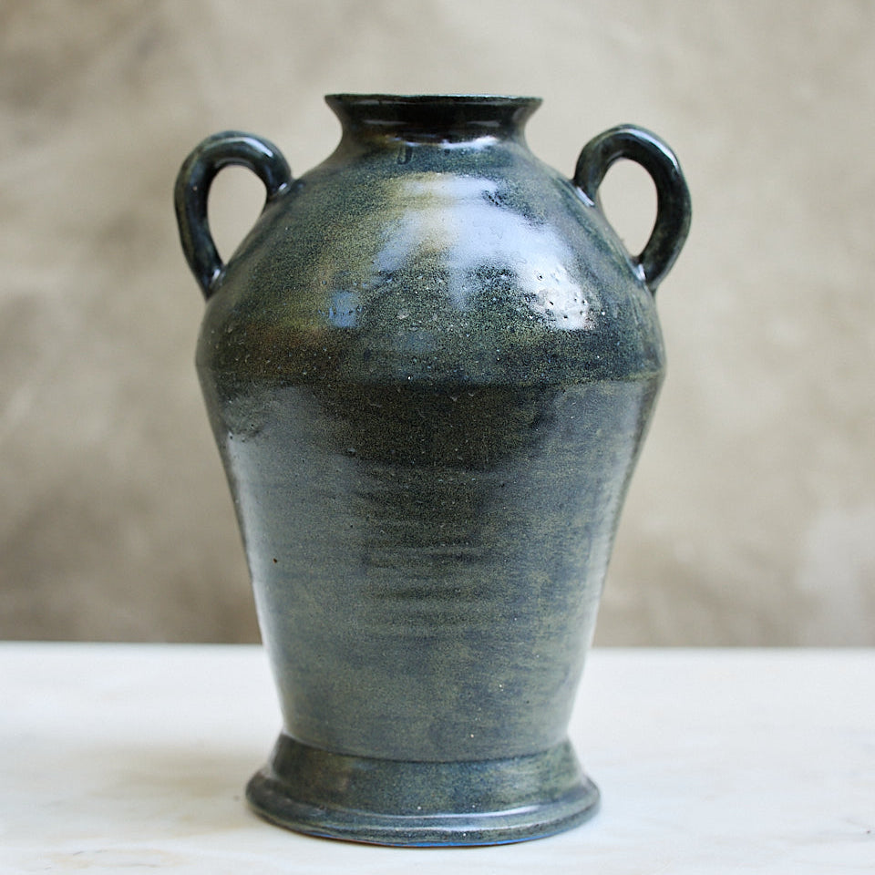 The Lake Jug pairs a timeless double-handled form with a gently flared foot and smooth, elongated neck. Finished in Katherine’s signature lake glaze, it reflects deep greens and soft earth tones with quiet depth.