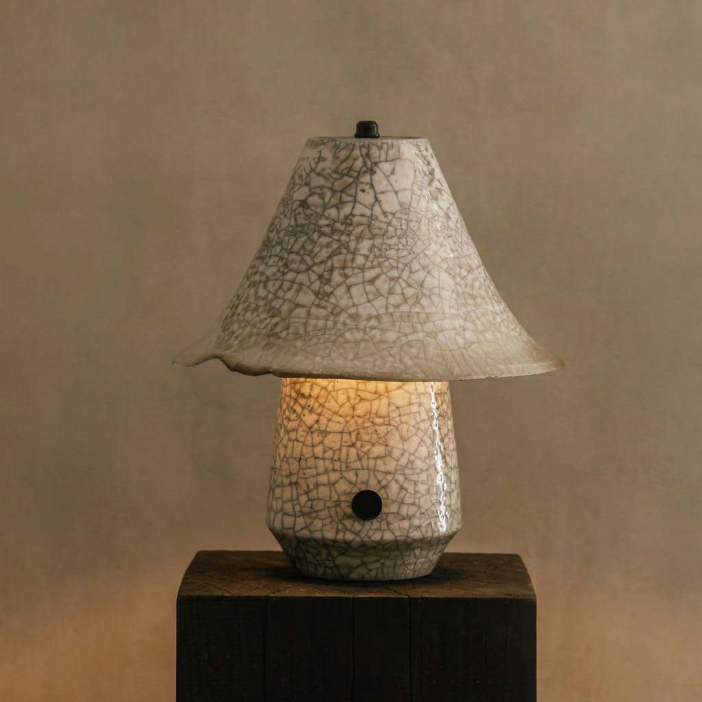 Nox is a fully ceramic table lamp, with both the base and shade wheel-thrown by hand and finished in a luminous, smoke-marked Raku glaze. The surface reveals the spontaneity of the firing process, crackled, irregular, and beautifully imperfect, giving each piece its own quiet intensity.