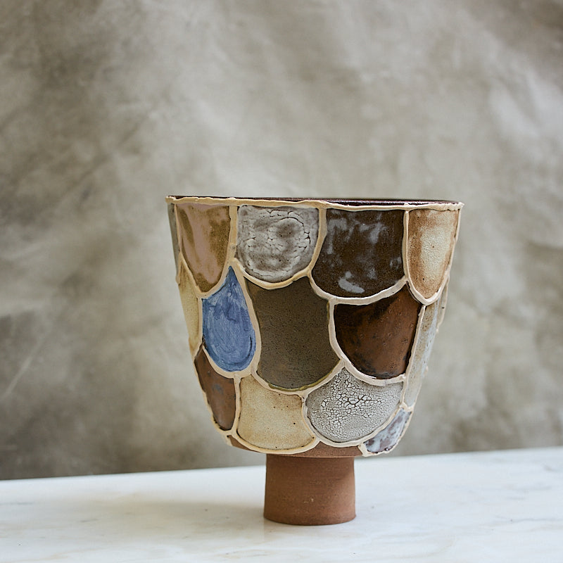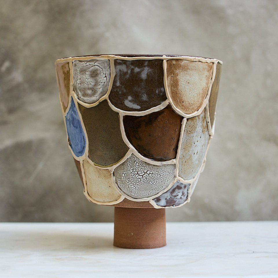 A masterclass in glaze experimentation, this pedestal is stitched together from fragments of Katherine’s studio tests—each one telling its own story in tone and texture. From crackle to gloss, earthy to icy, and even a pop of cobalt, no two tiles are quite alike. A collage of ceramic memory, grounded on a raw clay base. Watertight interior. Wholeheartedly one of a kind.