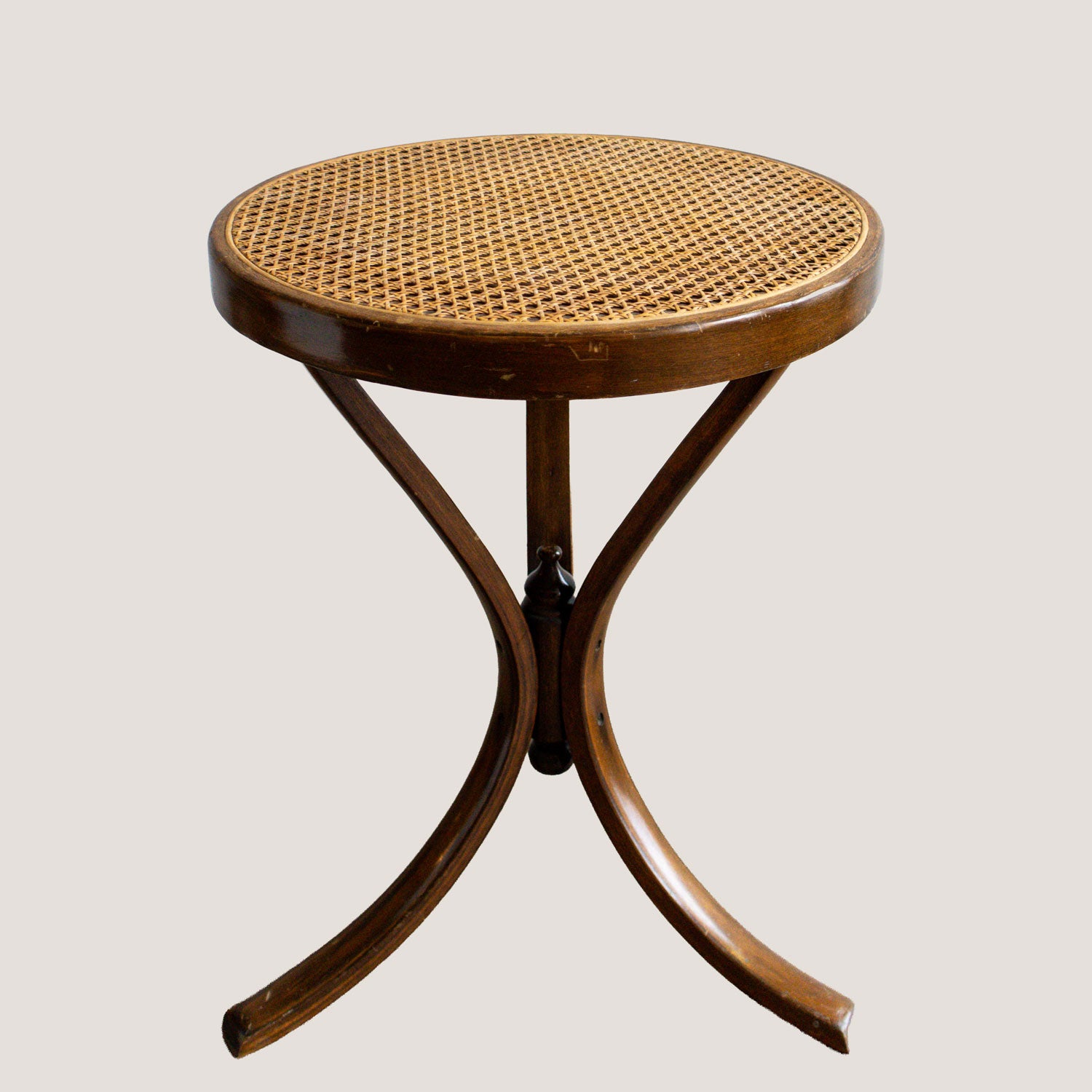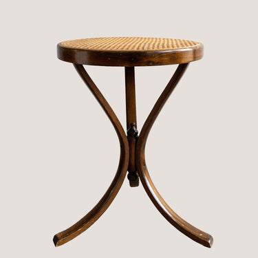 A charming vintage find with an unexpected silhouette, this side table features a sculptural tripod base with curving bentwood legs and a woven cane top. Lightweight yet sturdy, perfect beside a lounge chair or as a nightstand with character.